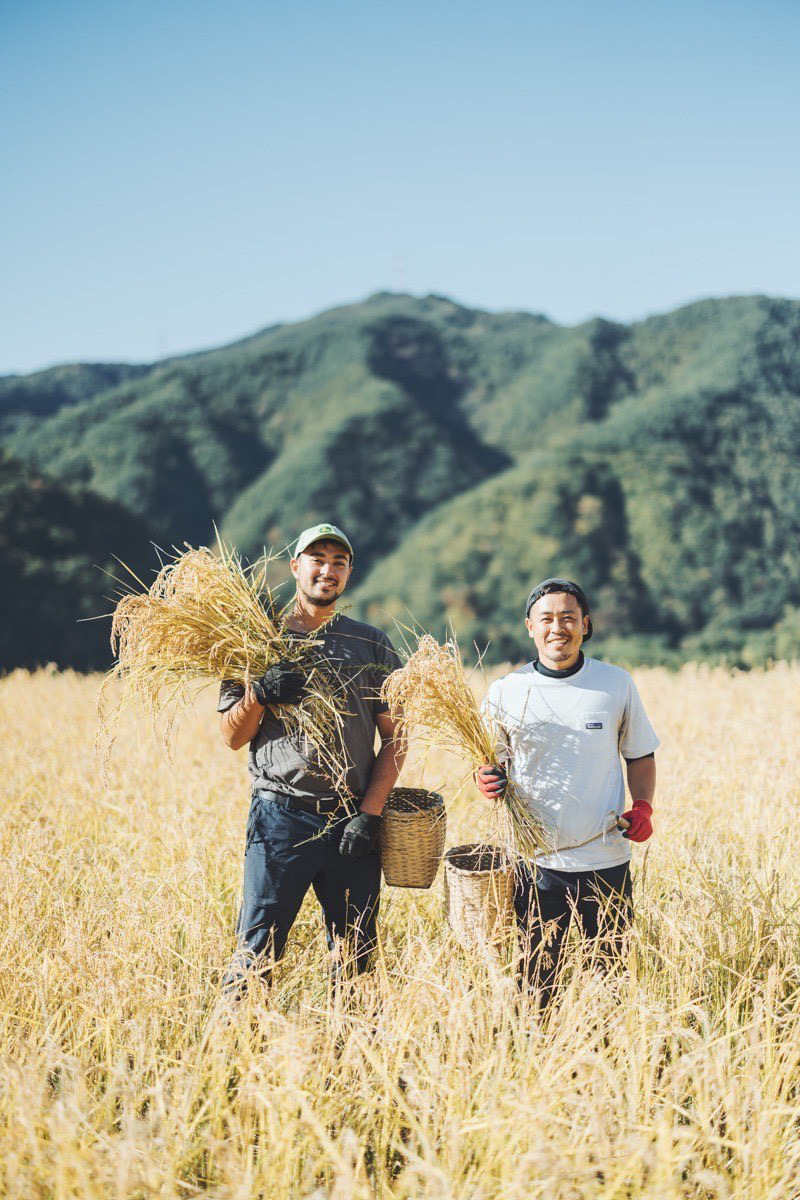 今回使用するのは、 長野県伊那市の農家・谷口さん(写真右)が栽培した山恵錦。 栽培期間中、 無農薬・化成肥料不使用で栽培されています。 伊那は標高が高く、 気温が安定した土地で、 カルシウムをはじめとするミネラルを豊富に含む水が流れる環境のなか育てられました。